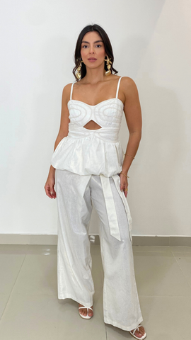 Top globo, con hilo elastico en la espalda para una horma perfecta. Nuestro top está confeccionado en lino metalizado , lo que lo hace una tela muy fresca.Adornos en millare para resaltar tu belleza natural