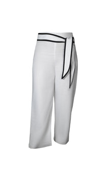 Pantalón recto, corredera trasera invisible, incluye cinturón en lino con sesgo.