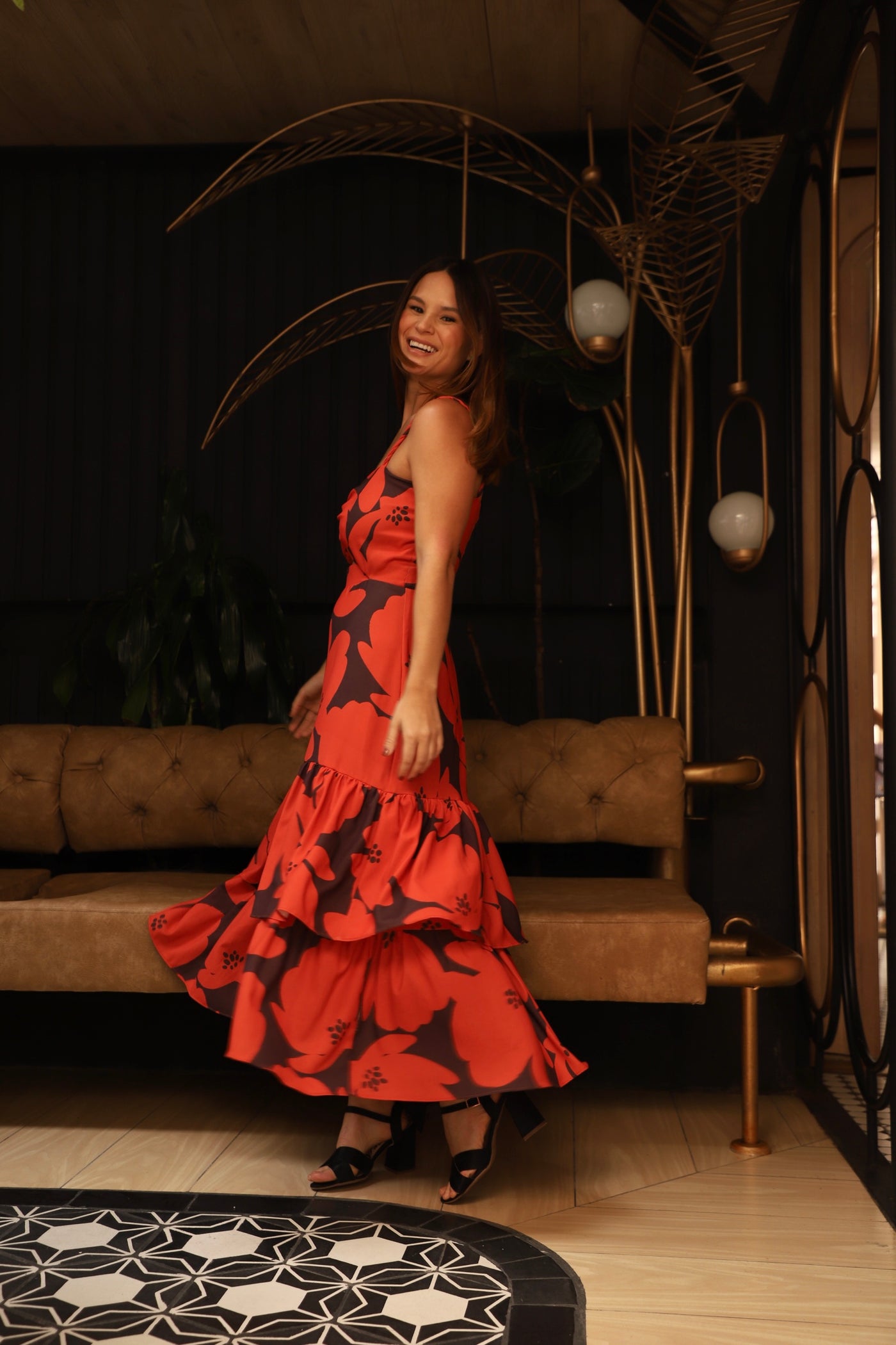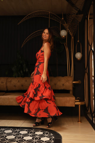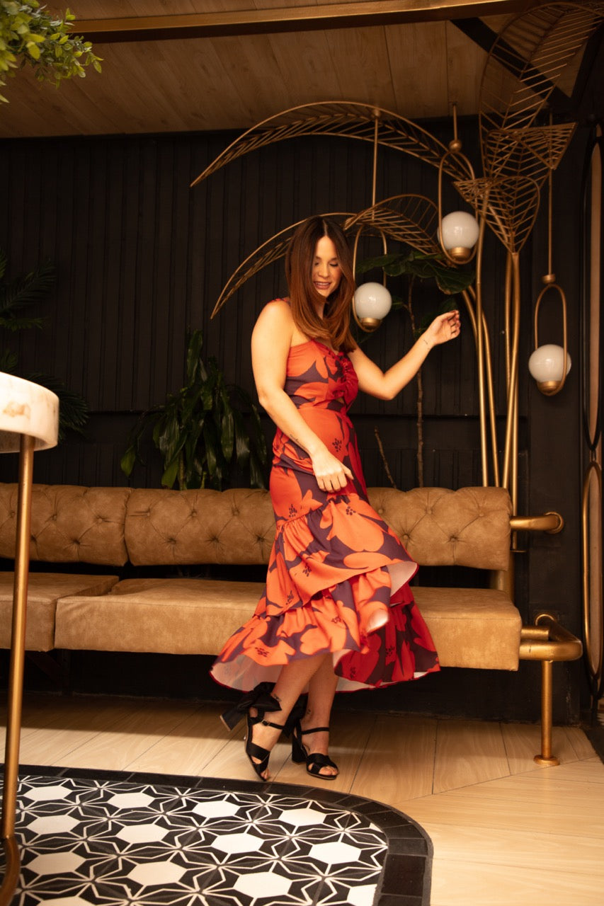Vestido midi estampado. Tiras tipo trenzadas, con arrunche en pecho y arandelas en falda.