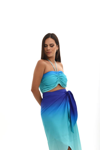 Top estampado degrade, elástico espalda, frunce en el centro y tiras de amarre cuello.